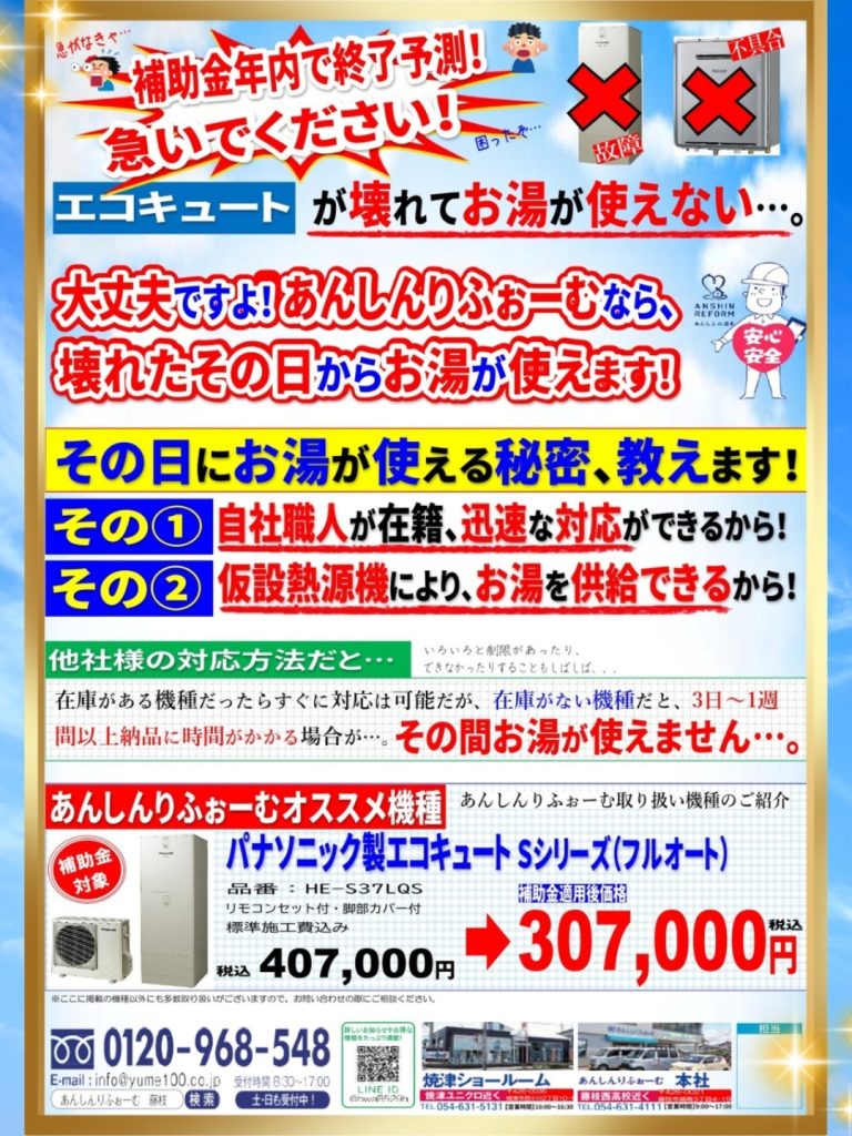 あんしんりふぉーむからお得なエコキュートのお知らせです😊 あんしんりふぉーむなら、なんとっっ‼️エコキュートが壊れたその日からお湯が使えるんです👏 詳しくはお気軽にお問い合わせください✨ -